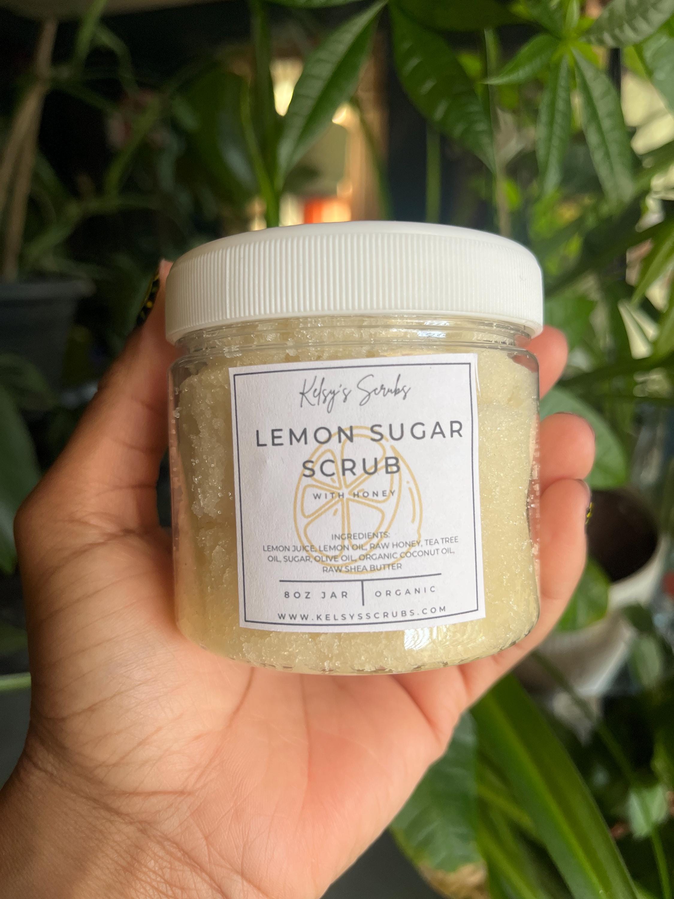 My lemon sugar scrub is FRAGRANCE FREE, made with coconut oil, raw shea butter, fresh lemon juice and lemon oil. Its made to help exfoliate dead skin and dirt from deep within the pores and it leaves your skin feeling fresh. You can use it on your face, lips, elbows, knees, legs, arms, feet and heels. For best results, use on wet skin, and use your favorite soap from Kelsy’s Scrubs after you use your sugar scrub. HOW TO USE: Wet skin with warm water, take desired amount, then gently massage onto skin to help diminish dark spots, acne scars, and help balance your skin tone. Rinse with warm water. Please moisturize skin with a light serum or moisturizer after using.